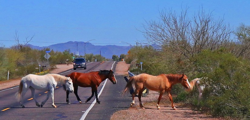 We knew it would be a great day when on the way out of Fountain Hills we cut through the Yavapi Nation Reservation just in time to see a small heard of wild mustangs crossing the road. By many, just seeing these beloved Mustangs is a sign of good fortune.